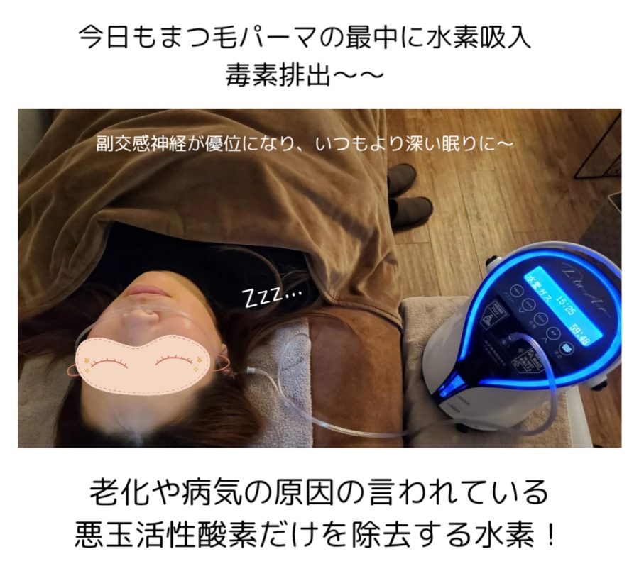フェイシャルやまつげパーマ+ヘッドマッサージにプラス水素吸入すると!お客様から 「いつもより深い睡眠が取れた」「夢ばかり見てちゃんと睡眠取れてなさそうで……水素やったら!スーッと寝れてスッキリした」などの嬉しい声を沢山いただきます